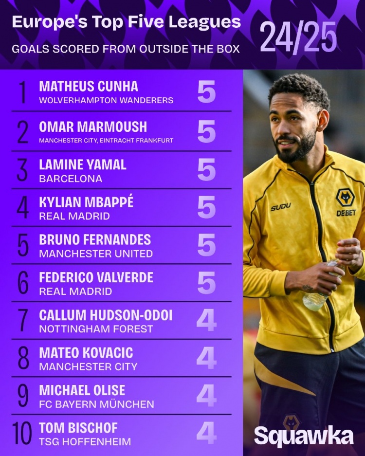 5月27日讯 欧洲五大联赛均以落幕,数据网站Squawka统计了2024-25赛季五大联赛球员禁区外破门次数排行榜,库尼...