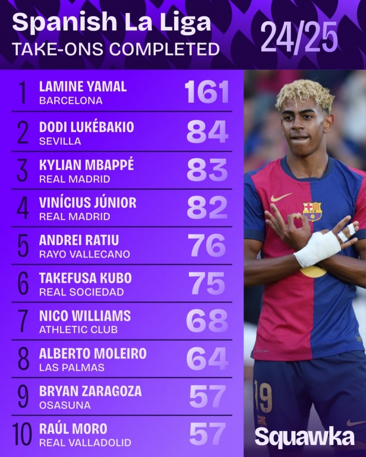 本赛季西甲成功过人榜:亚马尔161次断层居首,姆巴佩83次第三