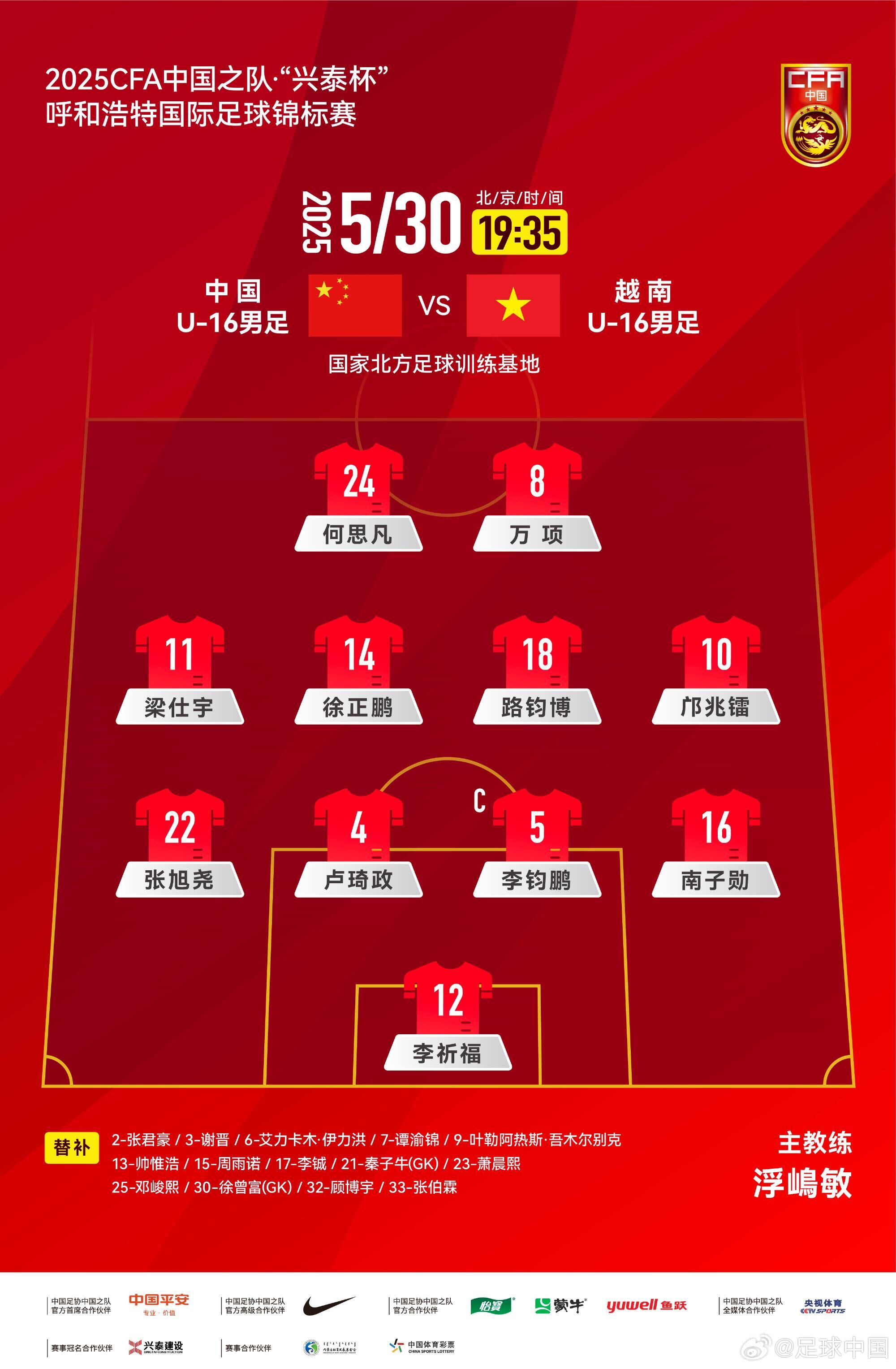05月30日讯 北京时间今晚19点35分,呼和浩特国际足球锦标赛,中国男足U16对阵越南U16,赛前首发阵容出炉!中国U...