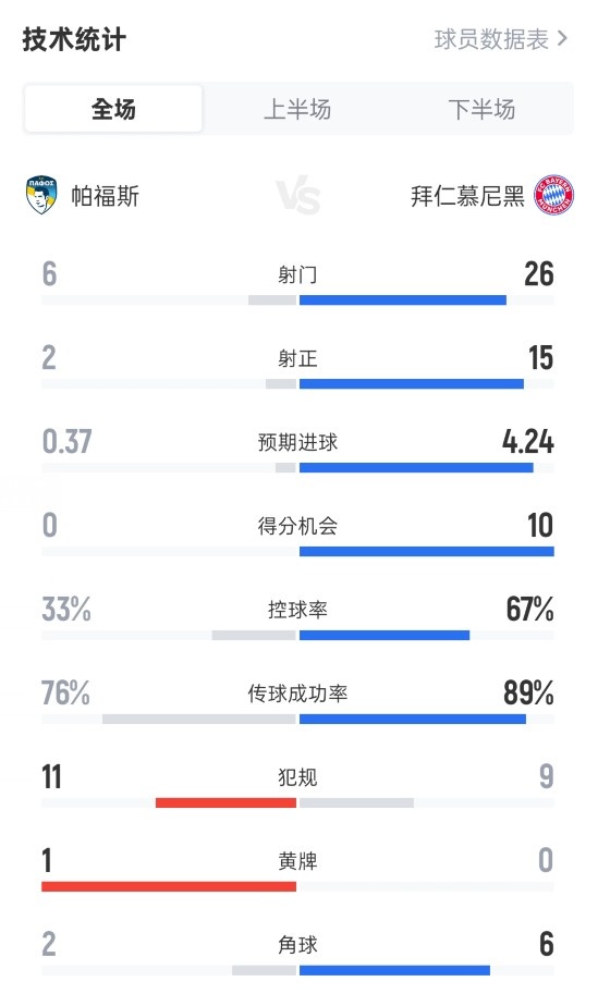帕福斯1-5拜仁全场数据:射门6-26,射正2-15,控球率33%-67%