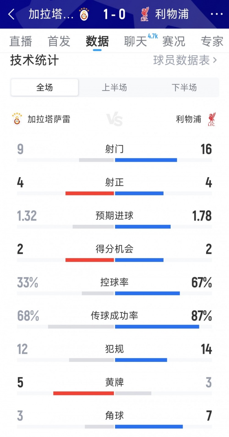 利物浦0-1加拉塔萨雷全场数据:射门16-9,射正4-4,得分机会2-2