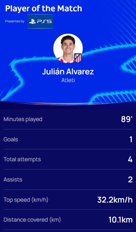 10月1日讯 在本轮欧冠,马竞5-1击败法兰克福。本场比赛阿尔瓦雷斯1粒进球2次助攻,赛后他也当选欧冠官方评选出的本场最...