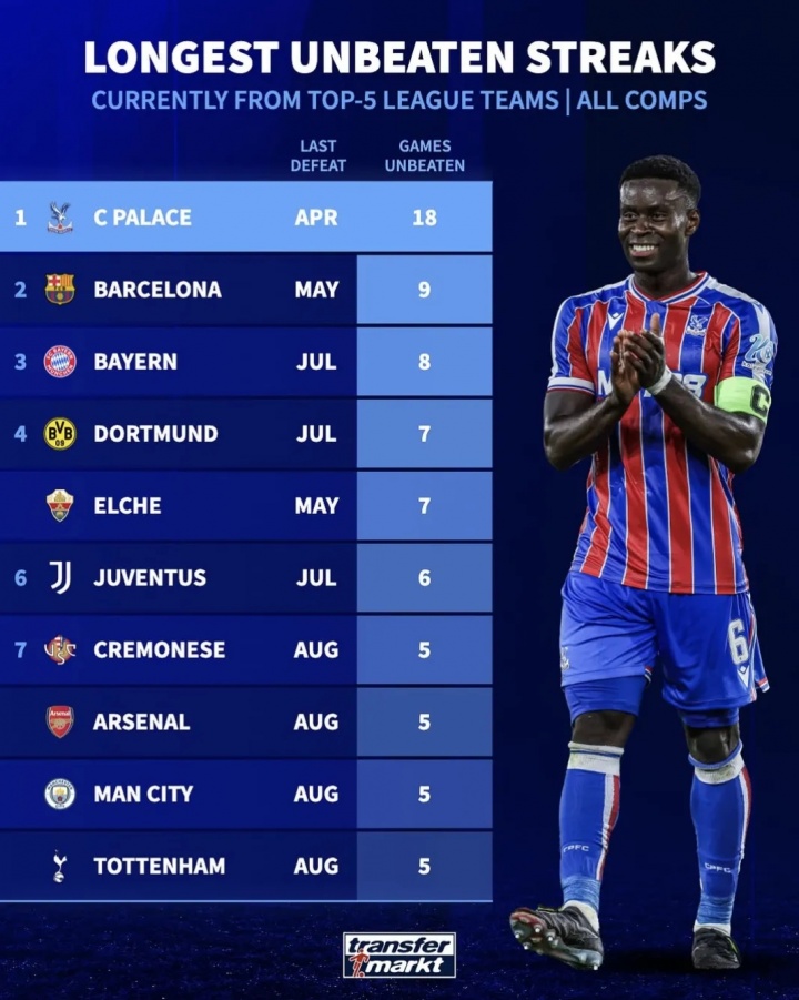 格拉斯纳有能!五大联赛当前不败榜:水晶宫18场最多,巴萨9场第2