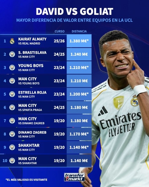 9月30日讯 欧冠联赛阶段第2轮,皇马将做客对阵阿拉木图凯拉特。“转会市场网”统计了欧冠单场对决双方身价差距最悬殊的10...