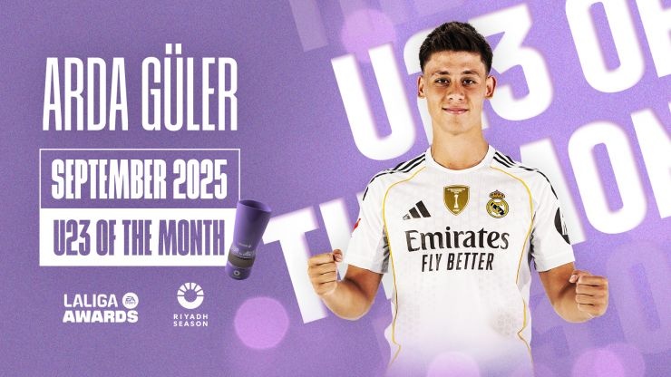 2球2助攻!官方:皇马中场居勒尔当选西甲9月份最佳U23球员