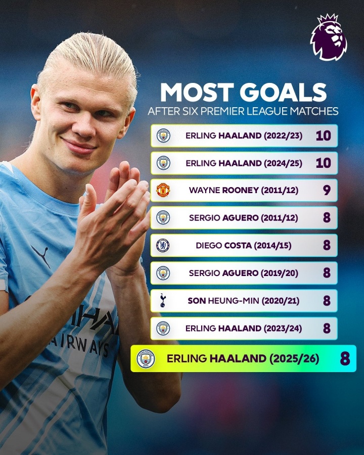 09月29日讯 英超官方晒出了一组数据,调侃哈兰德6轮“只”进8球,追平个人最差开局。数据显示,哈兰德本赛季前6轮攻入8...