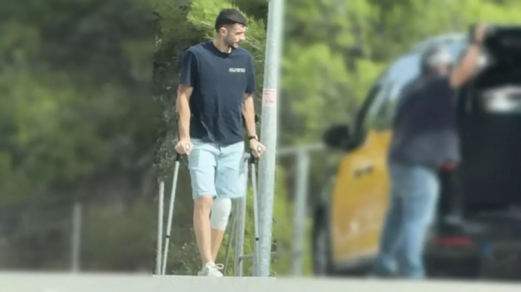 刚接受膝盖手术!霍安-加西亚被拍到拄拐现身巴萨基地