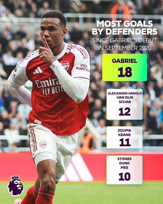 最强带刀后卫?自英超首秀以来,加布里埃尔打入18球冠绝英超后卫