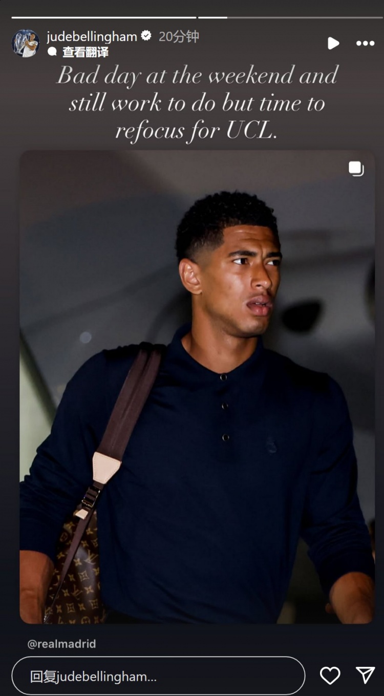贝林厄姆社媒:这个周末很糟糕,现在是时候重新专注于欧冠了