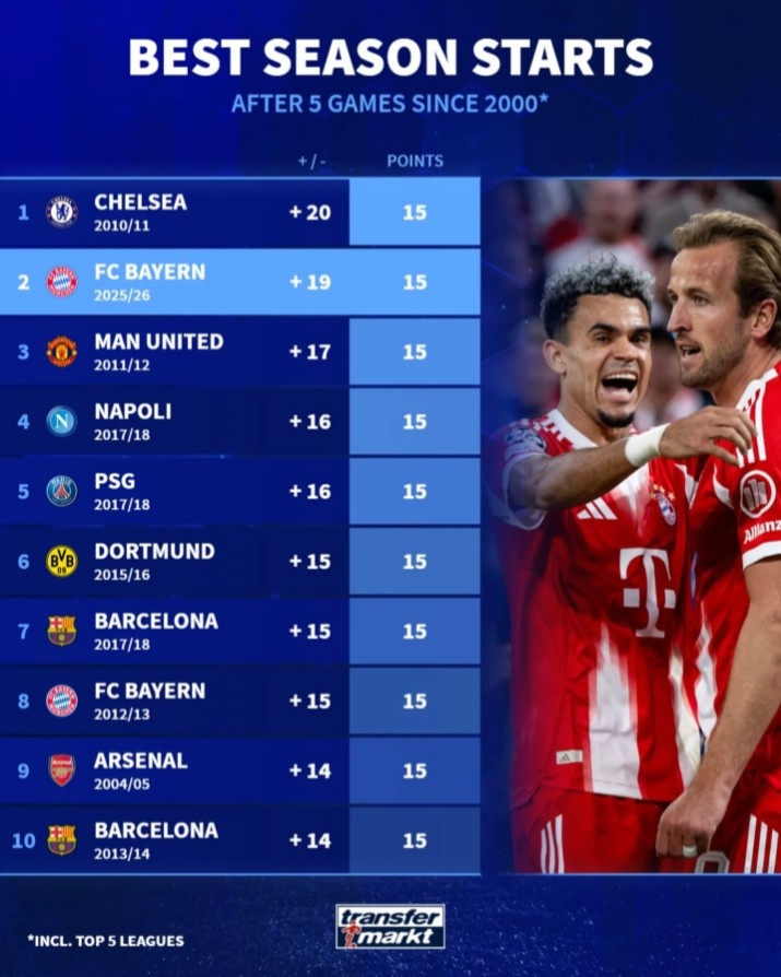 五大联赛前5轮后最佳战绩:本赛季拜仁第二,10/11赛季切尔西第一