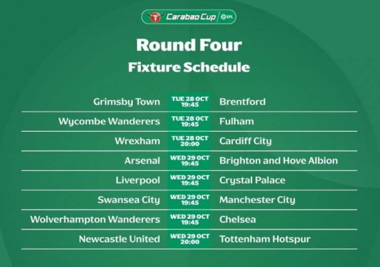 9月29日讯 联赛杯官方公布第四轮时间,阿森纳vs布莱顿、利物浦vs水晶宫将于北京时间10月30日周四03:45进行。附...