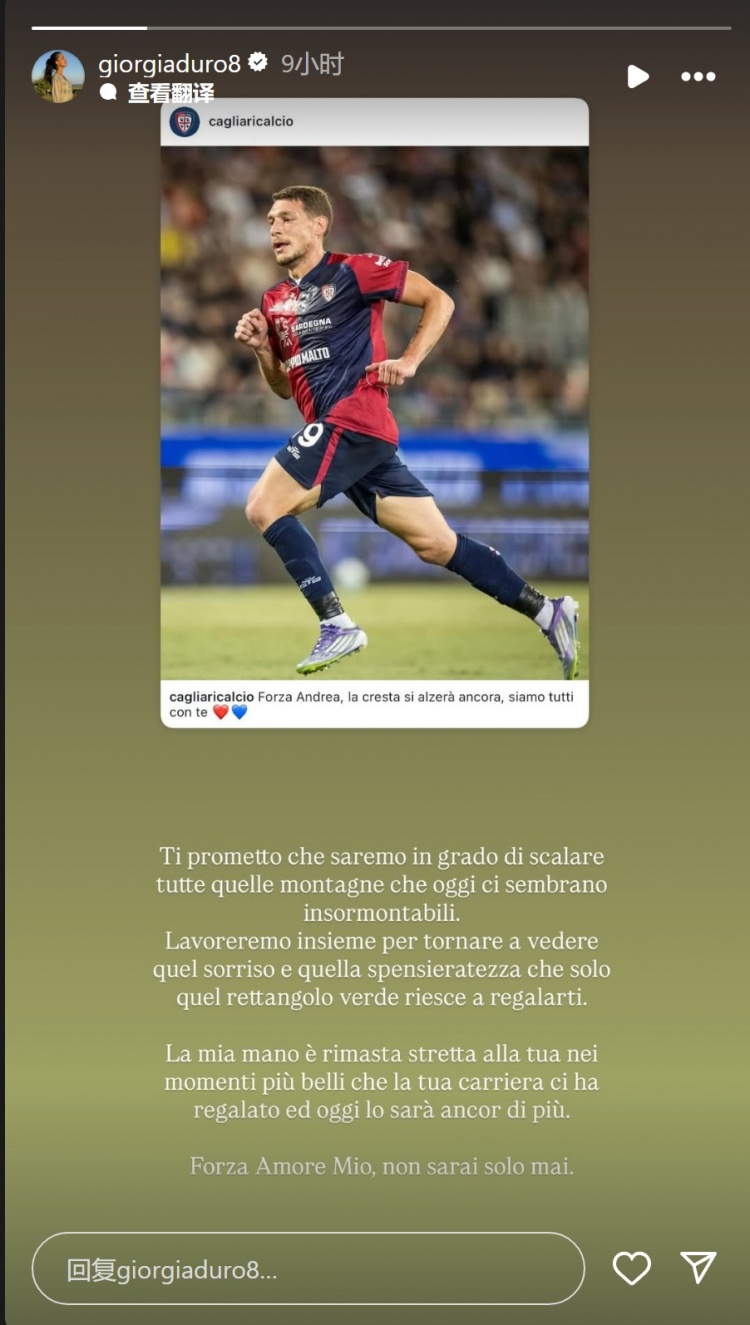 9月29日讯 卡利亚里前锋贝洛蒂对阵国米伤退,卡利亚里官方确认球员左膝前交叉韧带撕裂。贝洛蒂的妻子杜罗社媒发文:“我向你...