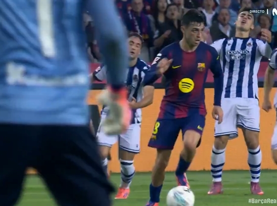 09月29日讯 西甲联赛第7轮,巴萨2-1逆转皇家社会。比赛中,佩德里丝滑带球过掉了皇家社会球员巴雷内切亚,后者无奈摊手...