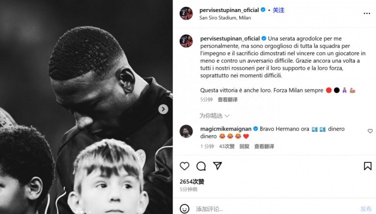 9月29日讯 米兰在本轮意甲2-1击败那不勒斯,在比赛中染红的埃斯图皮尼安通过社交媒体进行了道歉。埃斯图皮尼安特意用意大...
