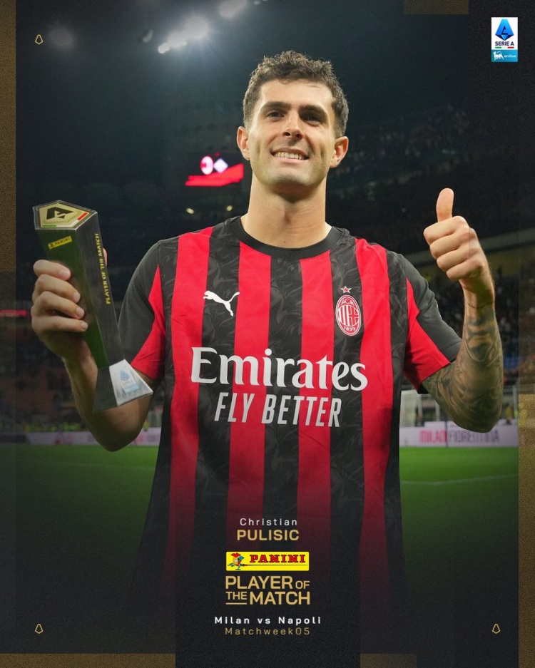 传射建功!官方:普利西奇当选米兰2-1那不勒斯全场最佳球员