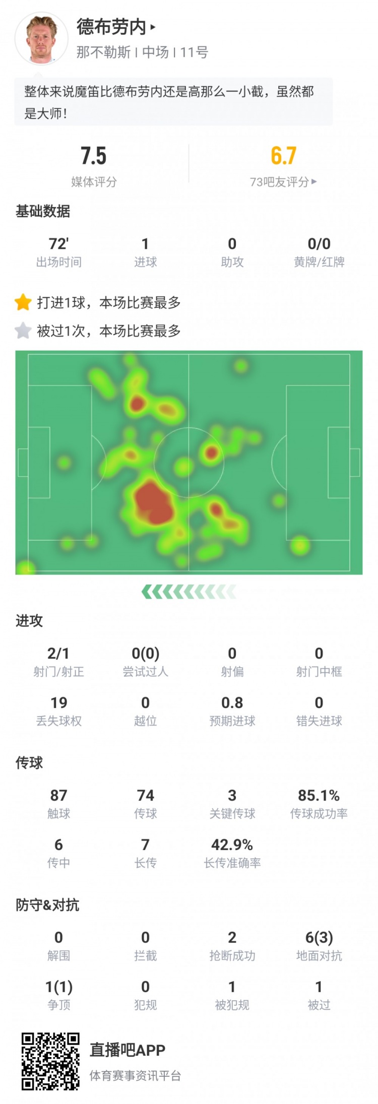 尽力了!德布劳内本场数据:点射破门、关键传球3次、评分7.5