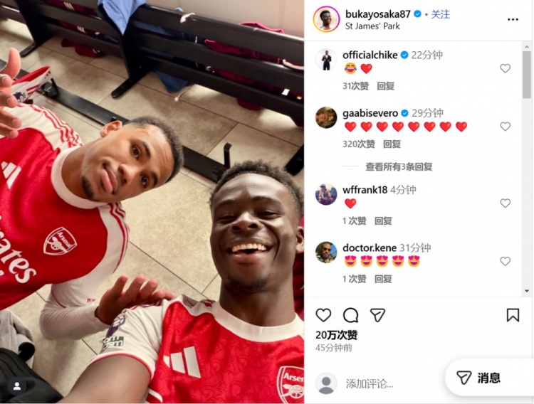 笑得灿烂!萨卡社媒晒和加布里埃尔合照庆祝2-1逆转纽卡