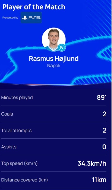 梅开二度,官方:霍伊伦当选那不勒斯2-1葡萄牙体育全场最佳