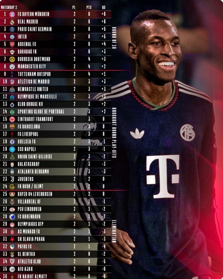 拜仁官推晒两轮过后欧冠积分榜:拜仁以进球优势领跑,皇马次席