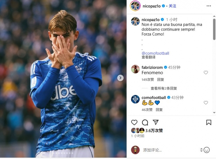 9月28日讯 科莫中场尼科-帕斯在社交媒体发文,鼓励球队。科莫本轮1-1战平克雷莫内塞,帕斯写道:“这不是一场精彩的比赛...