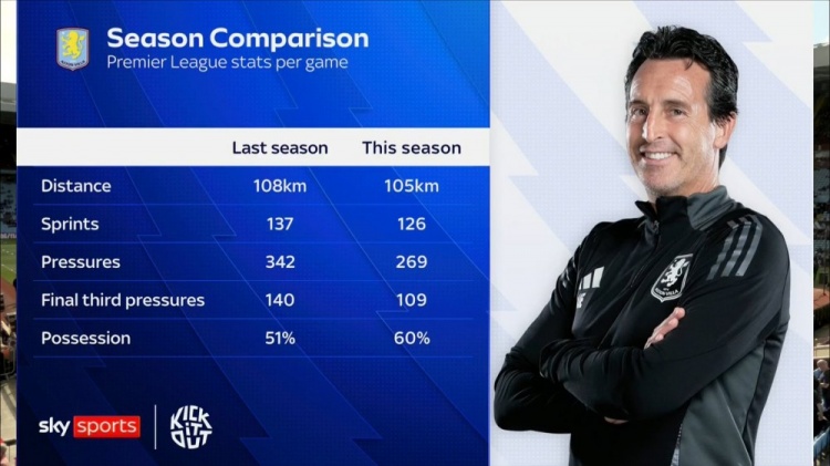 9月28日讯 本赛季英超,维拉0胜3平2负积3分,位居联赛第18位。日前,《天空体育》统计了维拉本赛季与上赛季的联赛场均...