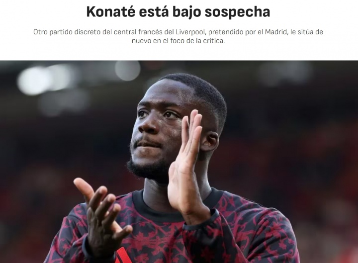 09月28日讯 本轮英超利物浦1-2遭水晶宫绝杀,西班牙媒体《阿斯报》聚焦了皇马引援目标——利物浦中卫科纳特的表现,指出...