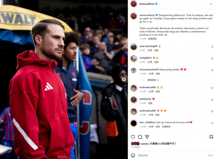 9月28日讯 在本轮英超,利物浦1-2遭绝杀不敌水晶宫。麦卡利斯特也在社媒发文鼓励球队,写道:“这是令人失望的下午,现在...