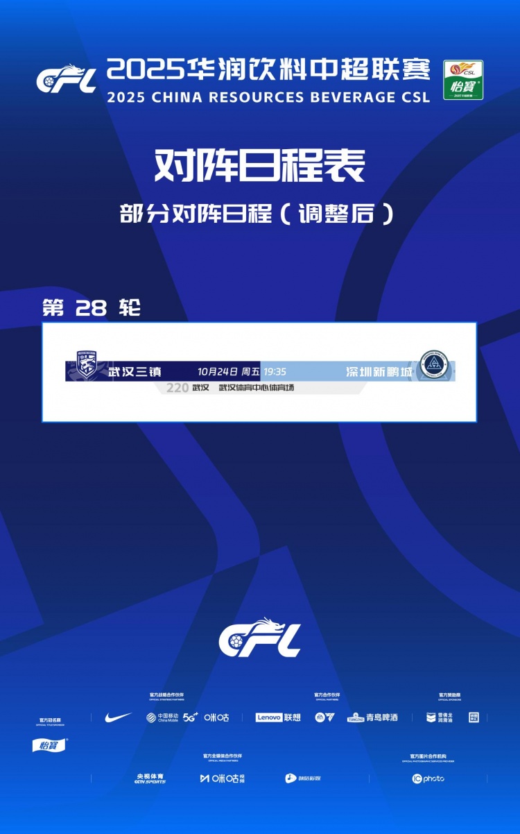 中超第28轮 武汉三镇vs深圳新鹏城改期至10月24日(周五)19:35