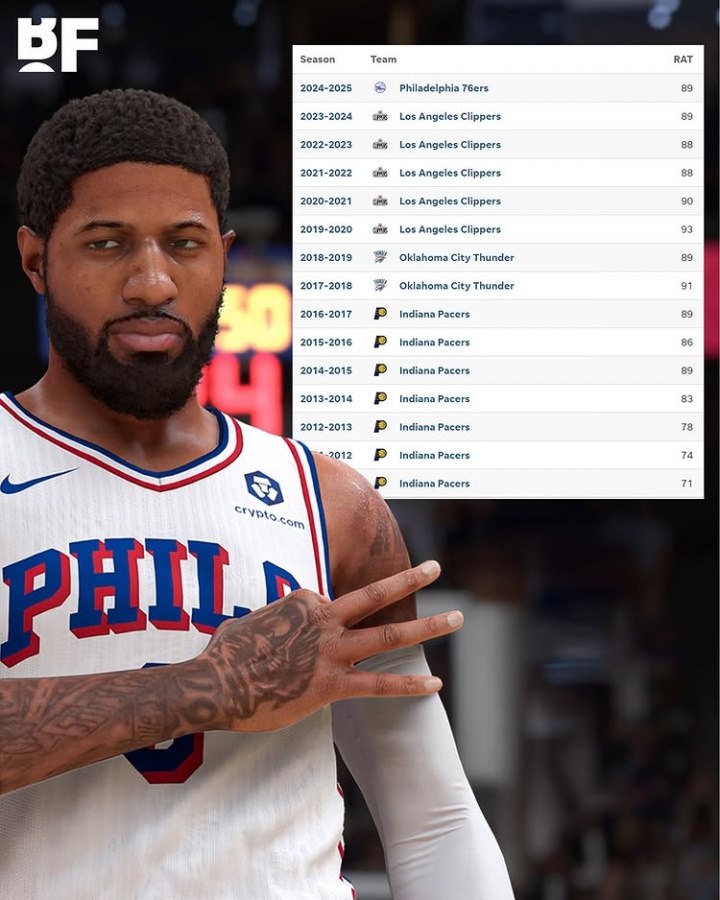 年薪5000万+!乔治2K26能力值跌至81!过去9个赛季都在88以上!