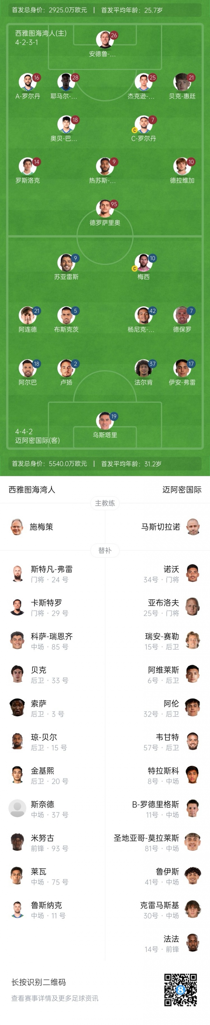 迈阿密国际替补:34-诺沃、25-亚布洛夫、14-法法、32-阿伦、15-瑞安-赛勒、41-鲁伊斯、30-克雷马斯基、8-特拉斯科、81-圣地亚哥-莫拉莱斯、57-韦甘特、6-阿维莱斯、11-B-罗德里格斯