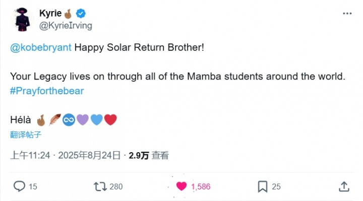 08月24日讯 当地时间今天是科比的47岁生日,凯里-欧文刚刚更新了推特给科比送上生日祝福。