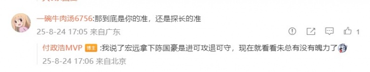 对于这种情况,有球迷在社媒上询问付政浩,付政浩对此回复道:“我说了宏远拿下陈国豪是进可攻退可守,现在就看看朱总有没有魄力了。”