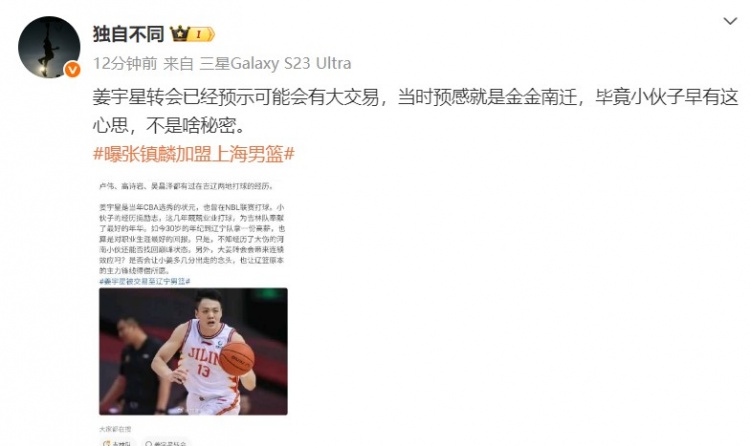 消息出来后,青岛男篮记者杜金城在个人微博上写道:“姜宇星转会已经预示可能会有大交易,当时预感就是金金南迁,毕竟小伙子早有这心思,不是啥秘密。”