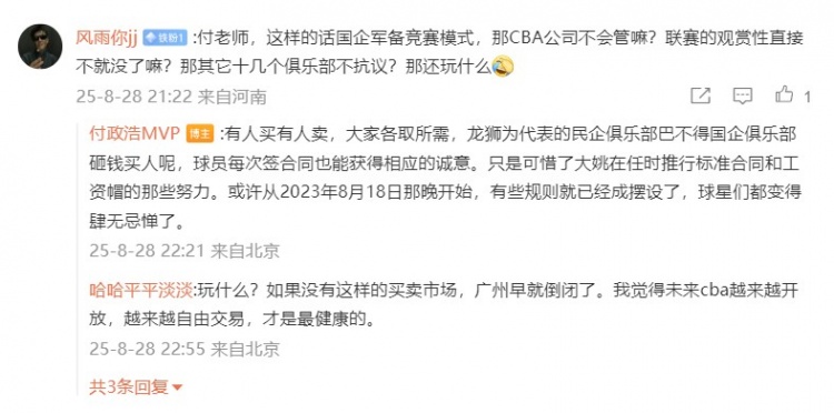 有网友表示这样的国企球队军备竞赛模式CBA不会管吗?付政浩回复:“有人买有人卖,大家各取所需,龙狮为代表的民企俱乐部巴不得国企俱乐部砸钱买人呢,球员每次签合同也能获得相应的诚意。只是可惜了大姚在任时推行标准合同和工资帽的那些努力。或许从2023年8月18日那晚开始,有些规则就已经成摆设了,球星们都变得肆无忌惮了。”