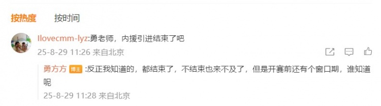 与网友互动时,@勇方方 表示他所知道的内援引进都结束了。