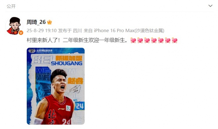 周琦更新个人微博,欢迎赵睿的到来,写道:“村里来新人了!二年级新生欢迎一年级新生。”