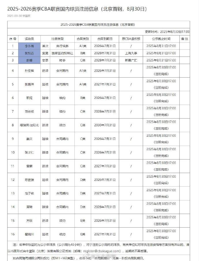 @三土带刺 在个人微博上写道:“北京首钢25-26赛季目前的本土阵容,曾凡博将会在31日预注册。