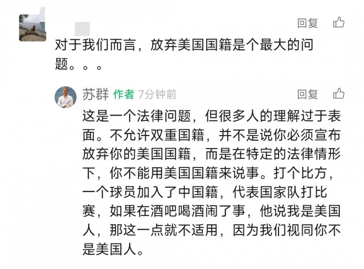 苏群: “这是一个法律问题,但很多人的理解过于表面。不允许双重国籍,并不是说你必须宣布放弃你的美国国籍,而是在特定的法律情形下,你不能用美国国籍来说事。打个比方,一个球员加入了中国籍,代表国家队打比赛,如果在酒吧喝酒闹了事,他说我是美国人,那这一点就不适用,因为我们视同你不是美国人。”
