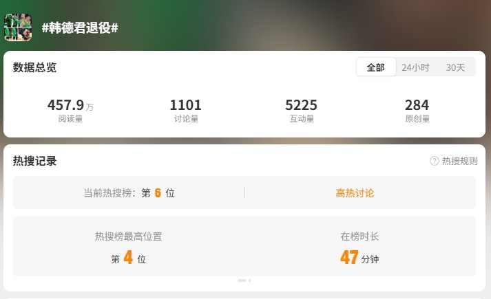 祝福!“韩德君退役”词条最高登上热搜第4 目前暂列第6位