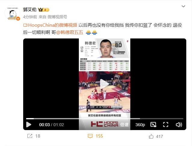 昔日队友!郭艾伦@韩德君:会怀念的 退役后一切顺利啊 哥