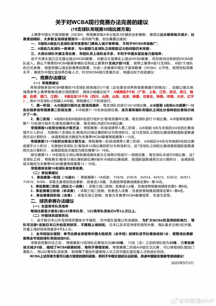 9月3日讯 今日,媒体人@付政浩更新社媒透露,WCBA正在向各俱乐部征集新赛季赛制的意见。