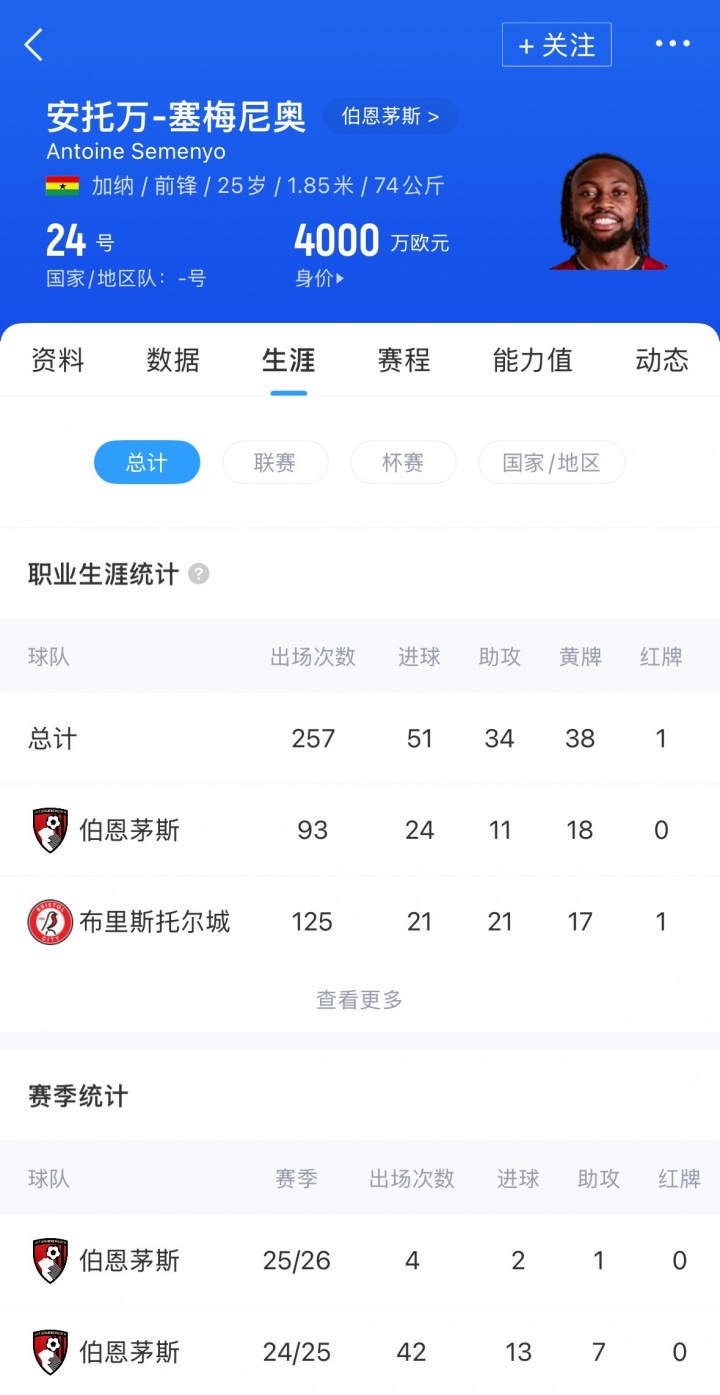 塞梅尼奥现年25岁,加纳前锋,上赛季代表球队42场,贡献13球7助,本赛季4场2球1助。目前球员德转身价为4000万欧元。