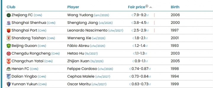 CIES中超球员价值榜:王钰栋最高920万欧,蒋圣龙450万欧