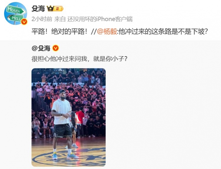 殳海在与杨毅互动时回应了之前的梗,同时表示詹姆斯走的不是下坡路,是绝对的平路。