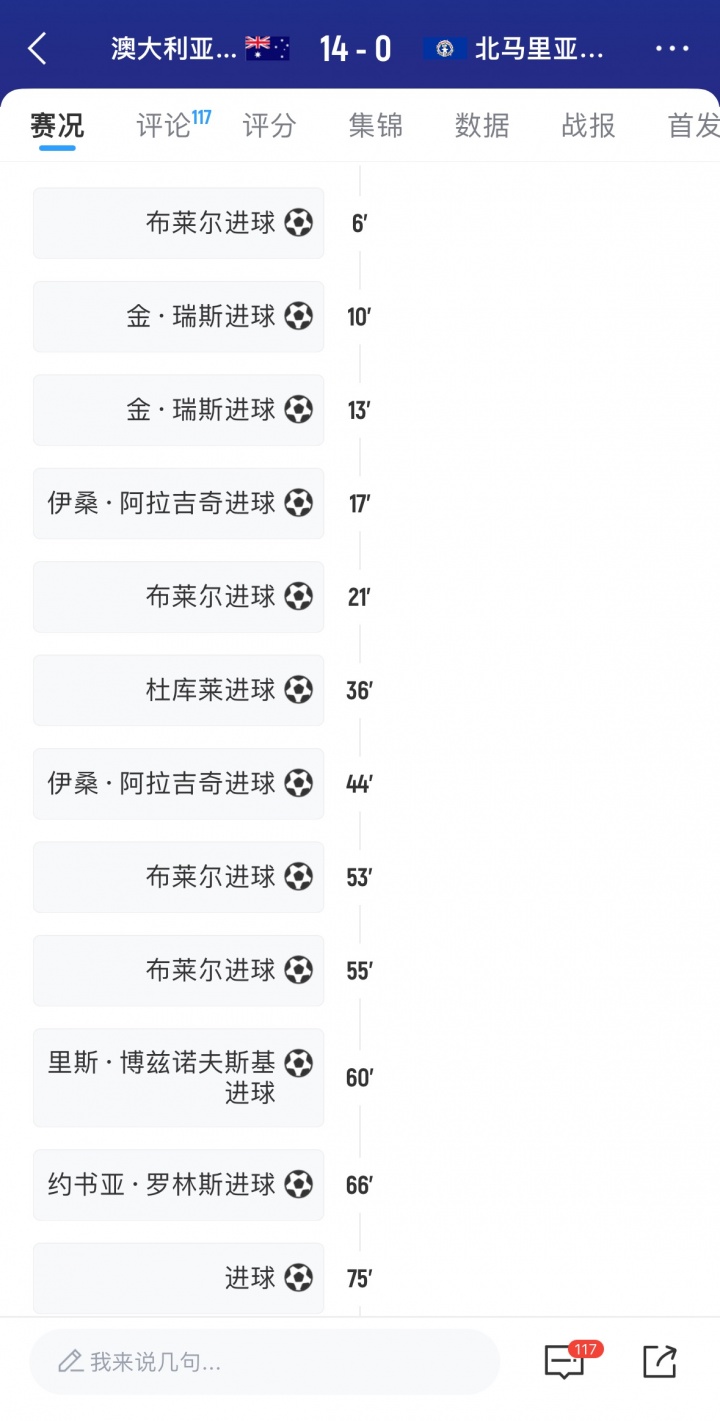 预选赛第1轮,澳大利亚14-0狂胜北马里亚纳群岛,上半场,澳大利亚就狂轰7球。