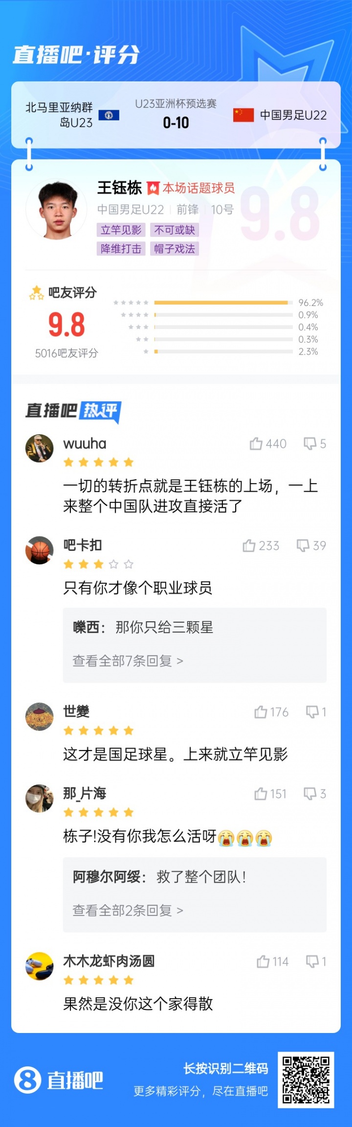 09月06日讯 U23亚洲杯预选赛第2轮,U22国足10-0横扫北马里亚纳。王钰栋下半场替补登场,贡献3射2传2次策动进球,独造7球,帮助球队在下半场取得比分上双。