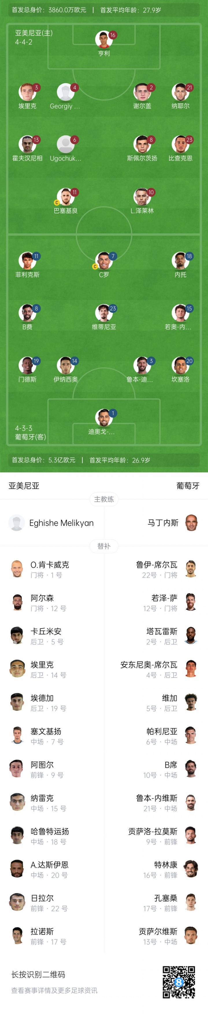 09月06日讯 世预赛欧洲区小组赛F组,亚美尼亚vs葡萄牙,赛前双方首发公布!由于此前参加欧国联,本场比赛是葡萄牙本届世预赛的第一场比赛。