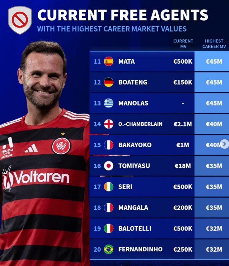 11.马塔,当前身价:50万,生涯最高身价:4500万