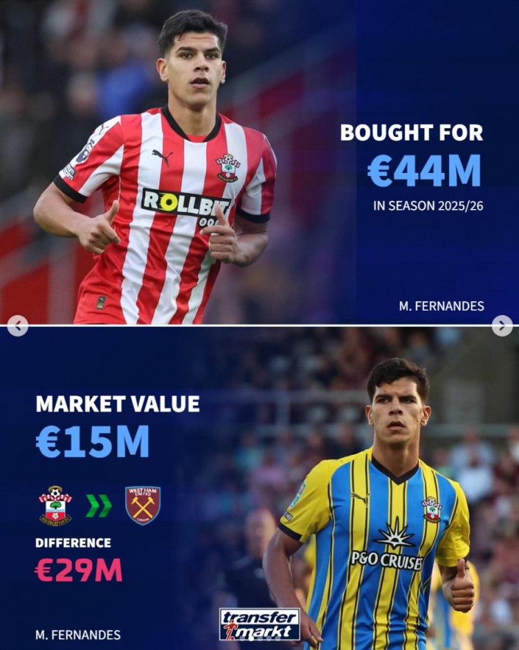 马特乌斯-费尔南德斯(南安普顿→西汉姆联):身价1500万,转会费4400万,溢价2900万欧元