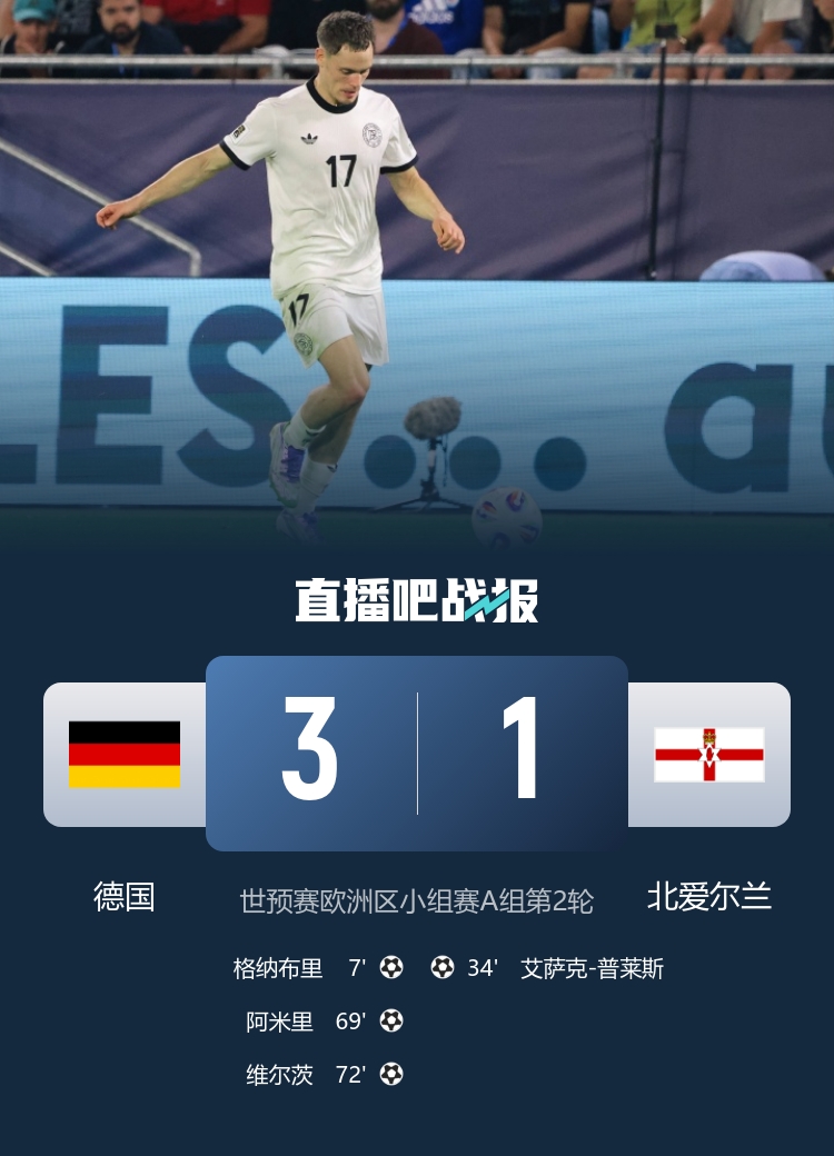 9月8日讯 北京时间9月8日凌晨2时45分,世预赛欧洲区小组赛A组第2轮,德国坐镇莱茵能源球场对阵北爱尔兰。上半场,格纳布里首开纪录,普莱斯扳平,随后劳姆打进一球,但是被判越位在先。德国半场1-1战平北爱尔兰。下半场,替补登场的阿米里打进一球,随后维尔茨任意球破门。最终德国3-1击败北爱尔兰,终结各项赛事三连败颓势。